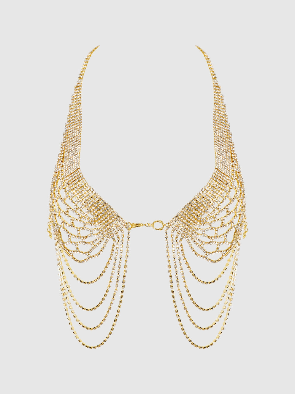 Tease like a superstar in this Rhinestone Net Halter with Openable Front. Diamond-like shine drapes over your curves with glimmering rhinestones on a triangle bra silhouette. Unhooks from the front for easy access to temptation. Finished with cascading strands for extra flair.
