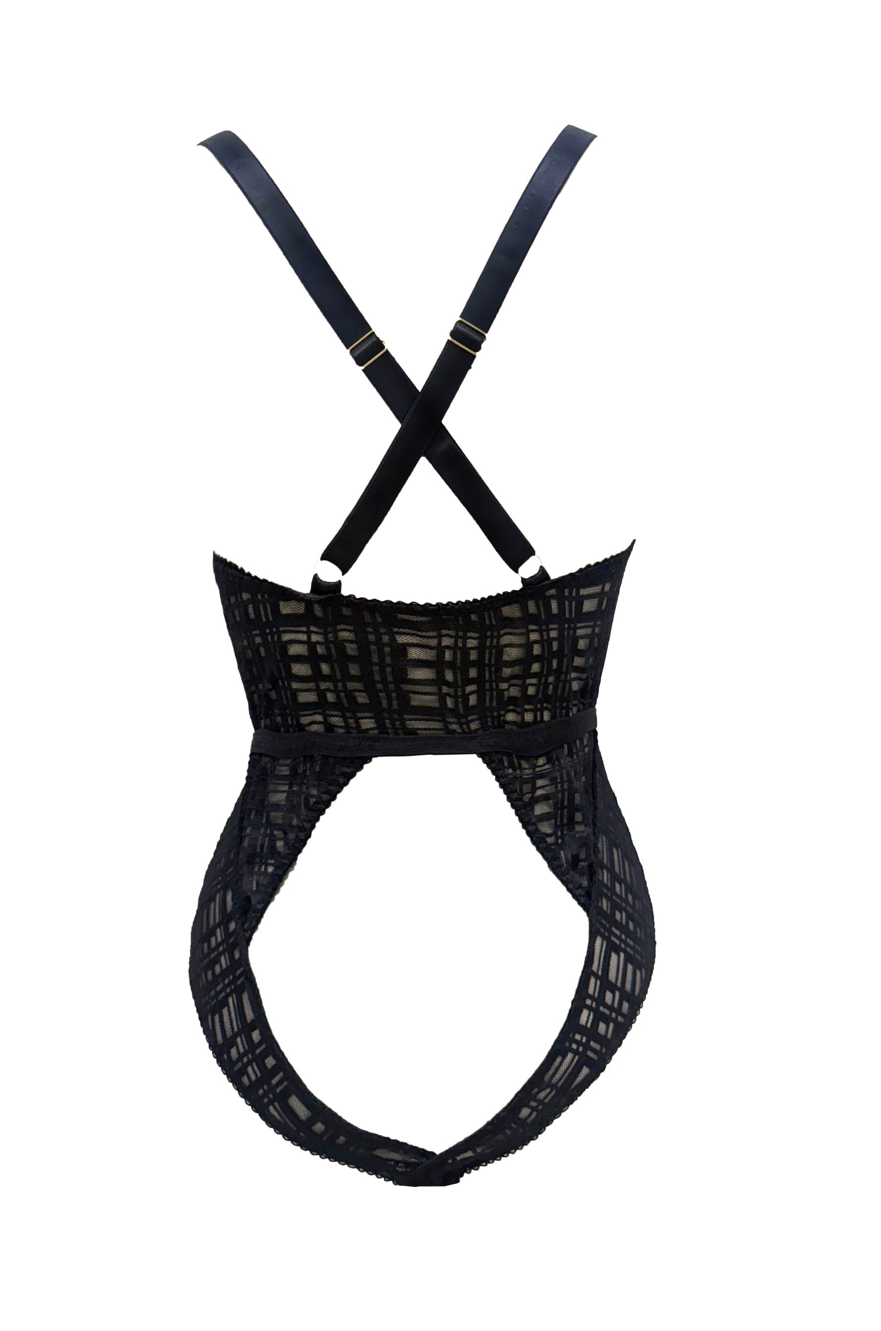 The Inca Trail Stretch Ouvert Bodysuit features geometric check stretch tulle in elegant black, combining a sensual look with sophisticated coverage. Its V-neckline and waist cinch detail enhance your silhouette, while the ouvert back and peek-a-boo design add a daring touch. Wide adjustable straps with grosgrain ribbon detail offer comfort and style, paired with inner thigh hook-and-eye closures for a secure fit. Designed to be worn beyond the bedroom, this bodysuit balances revealing elements with a fully covered front for a confident, refined appearance.