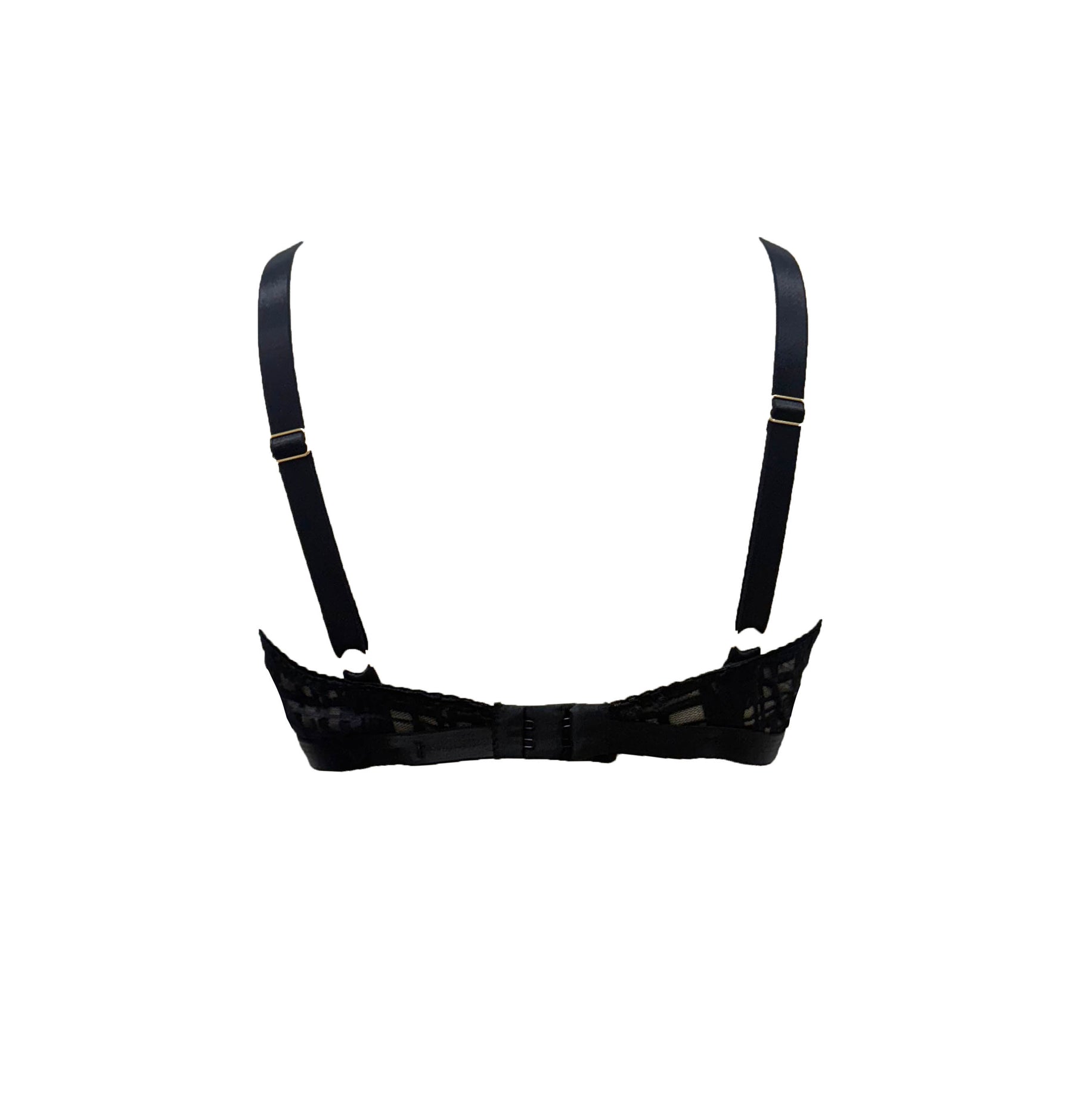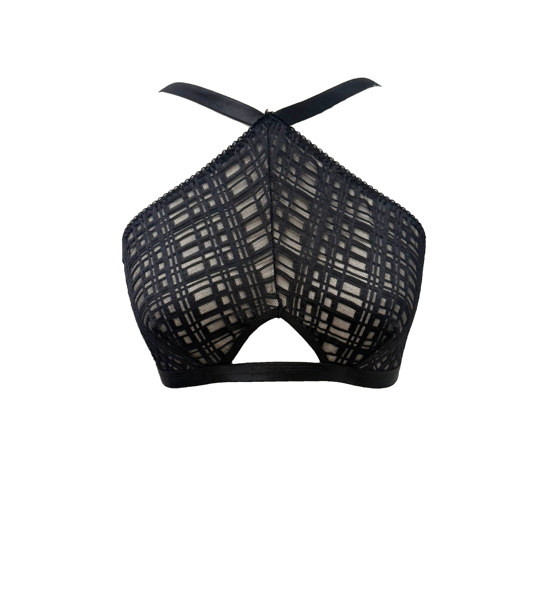 This style is made with our geometric check stretch tulle and features a cut out detail at center front and side boning for support. Regular bra strap back.