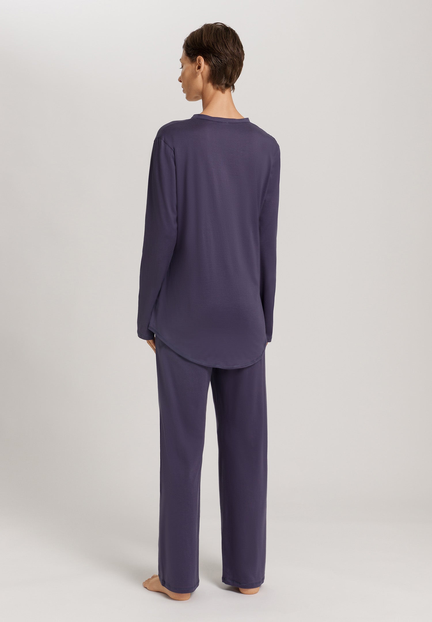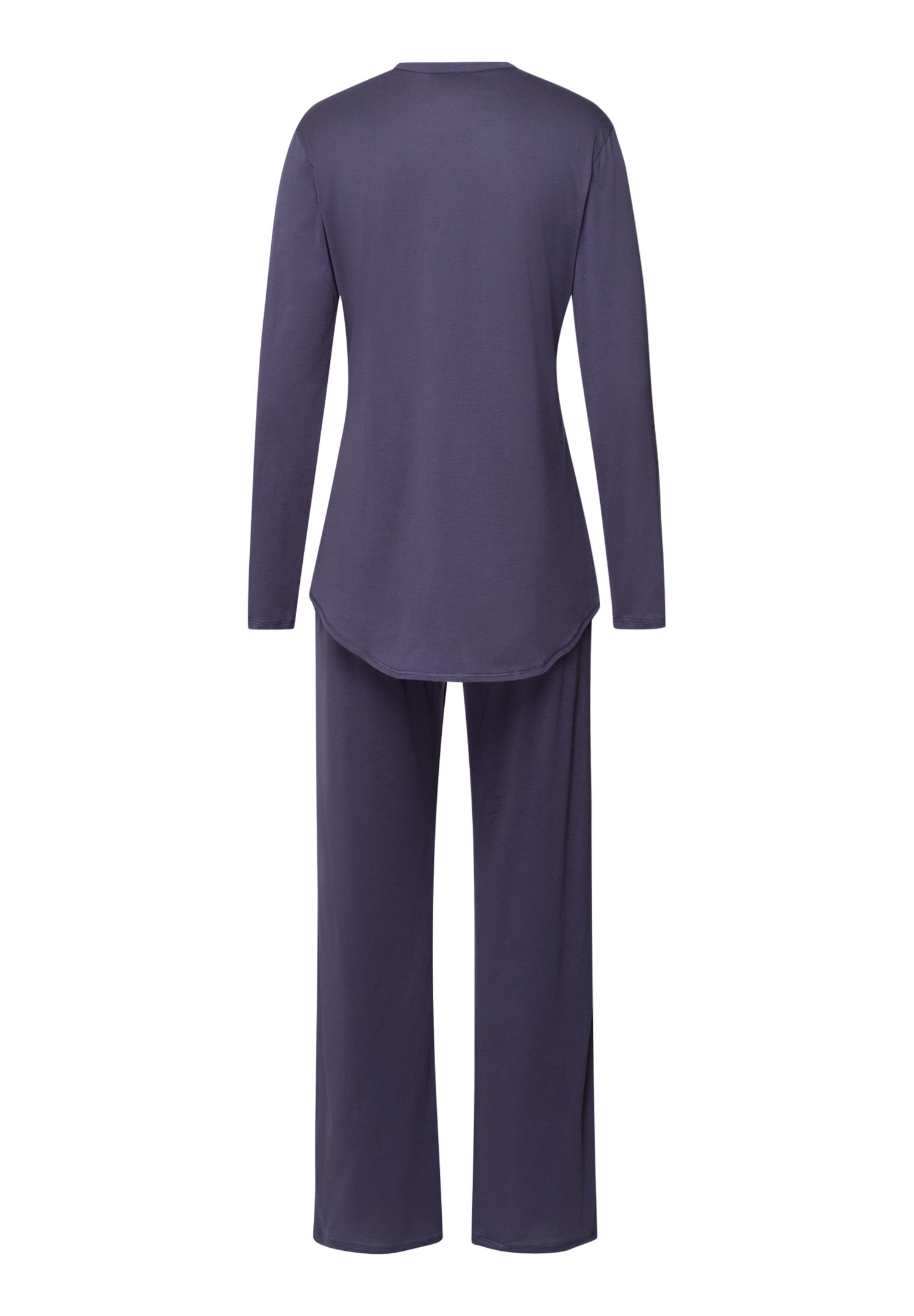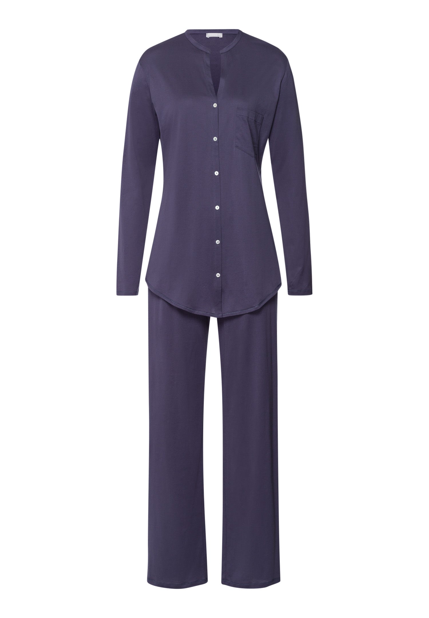 Clean and contemporary, the HANRO Cotton Deluxe Long Sleeve Button Front Pajama set combines classic pajama styling with functional, fashionable design elements. The long sleeve pajama top has a button front with mother-of-pearl buttons and a practical chest pocket, while the full-length pajama pants feature a covered elastic waistband for a custom fit.